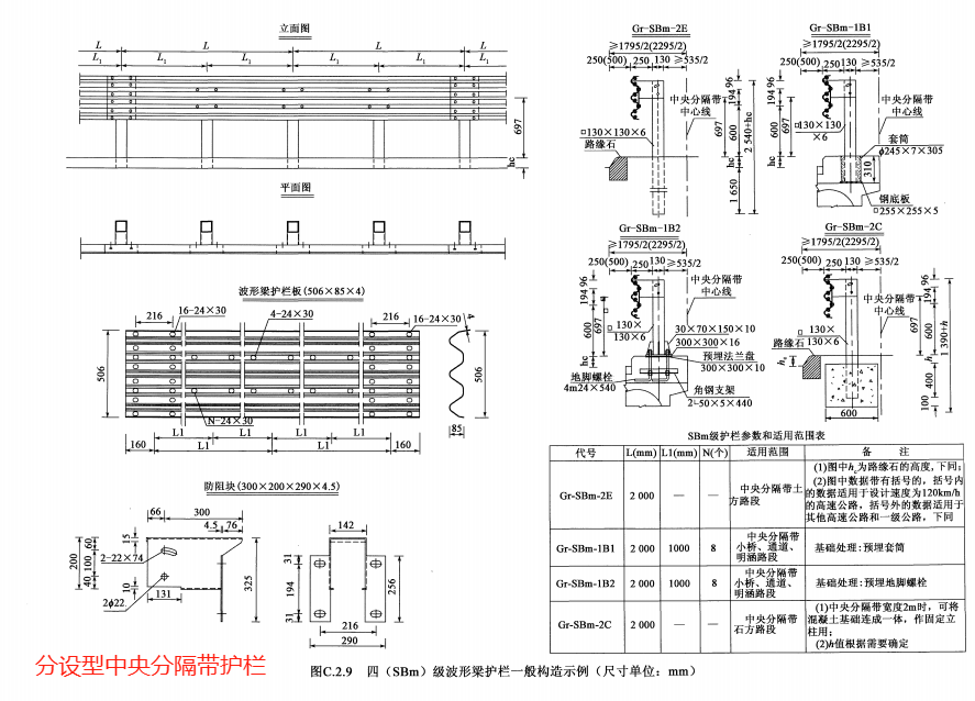 分設型波形梁護欄規(guī)格參數(shù)和適用范圍表(以SBm級為例):