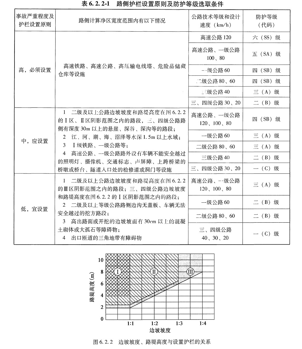 1、按照現行《公路交通安全設施設計規范》(JTG D81)的規定,事故嚴重程度可分為三個等級:高、中、低,應按表 6. 2. 2-1 的規定設置路側護欄并選取路側護欄的防護等級。