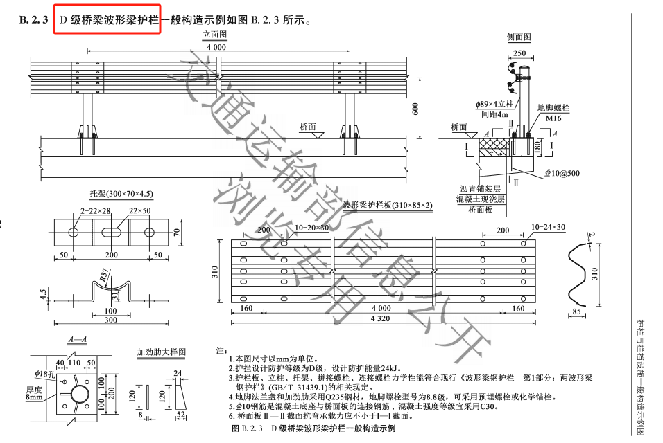 對于設置在橋梁路段時,細則也有詳細的說明:橋涵高度大于4m或橋涵下水深1.5m以上時應設置護欄,與路基段相同,一般情況下采用D級。通行客運班線時,橋梁護欄的防護等級采用C級。上跨公路、鐵路或城市飲用水源保護區時,橋梁護欄的防護等級采用B級。