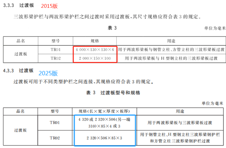 3、兩波護欄與三波護欄之間的過渡板在規(guī)格、尺寸上也做了較大的變動。說實話,從業(yè)這么多年,光顧著埋頭報價了,也可能還是見的少,就沒見過哪個圖紙的過渡板是15版那個規(guī)格的,最近整理規(guī)范標準才發(fā)現(xiàn),有時間還是要多多學(xué)習(xí)呀!